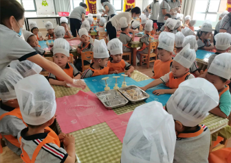 通过中秋节引出月饼,和小朋友互动提问讨论月饼相关话题。出示小朋友带的不同口味、品种的月饼,并说一说自己觉得月饼是怎样制作的,随后师生一起制作了月饼。