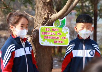 大班的小朋友们将写有爱护树木保护环境的标语牌挂到公园的树木上,提醒着来往的人们爱护我们的树木,拥抱春天,播种希望。